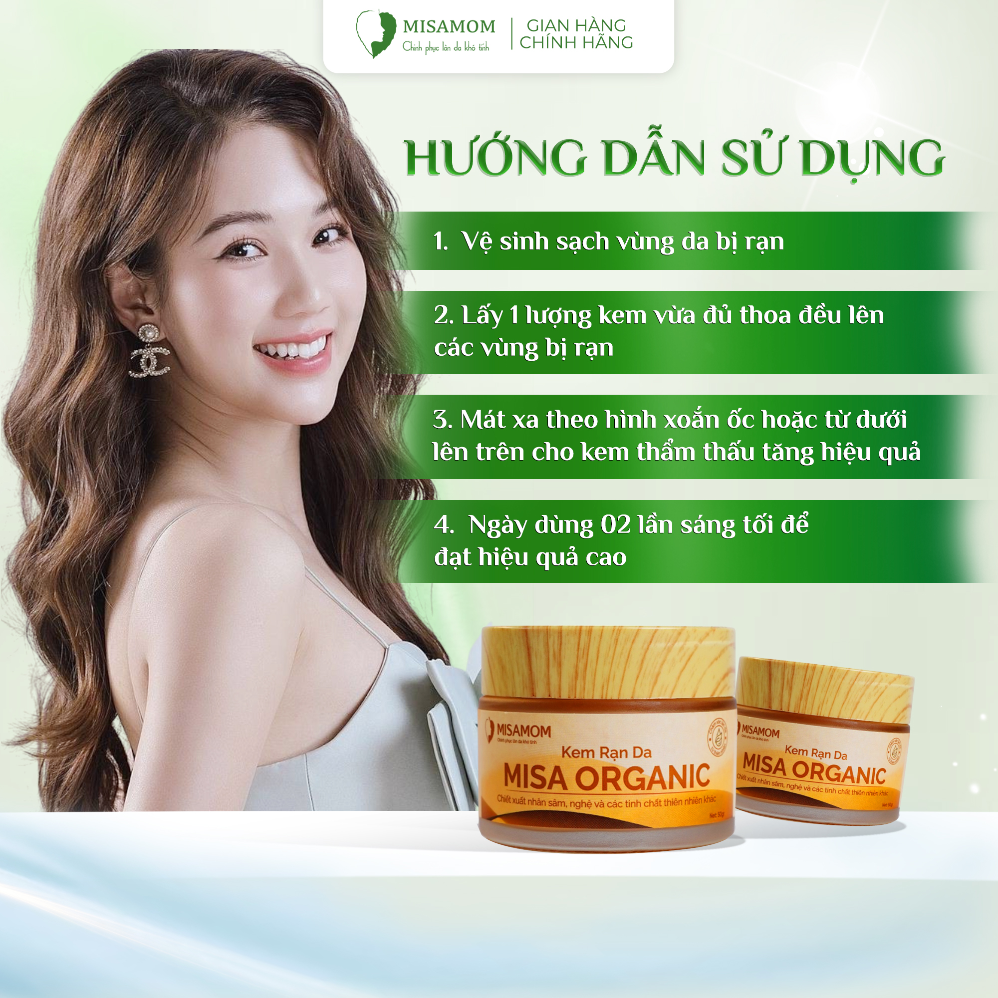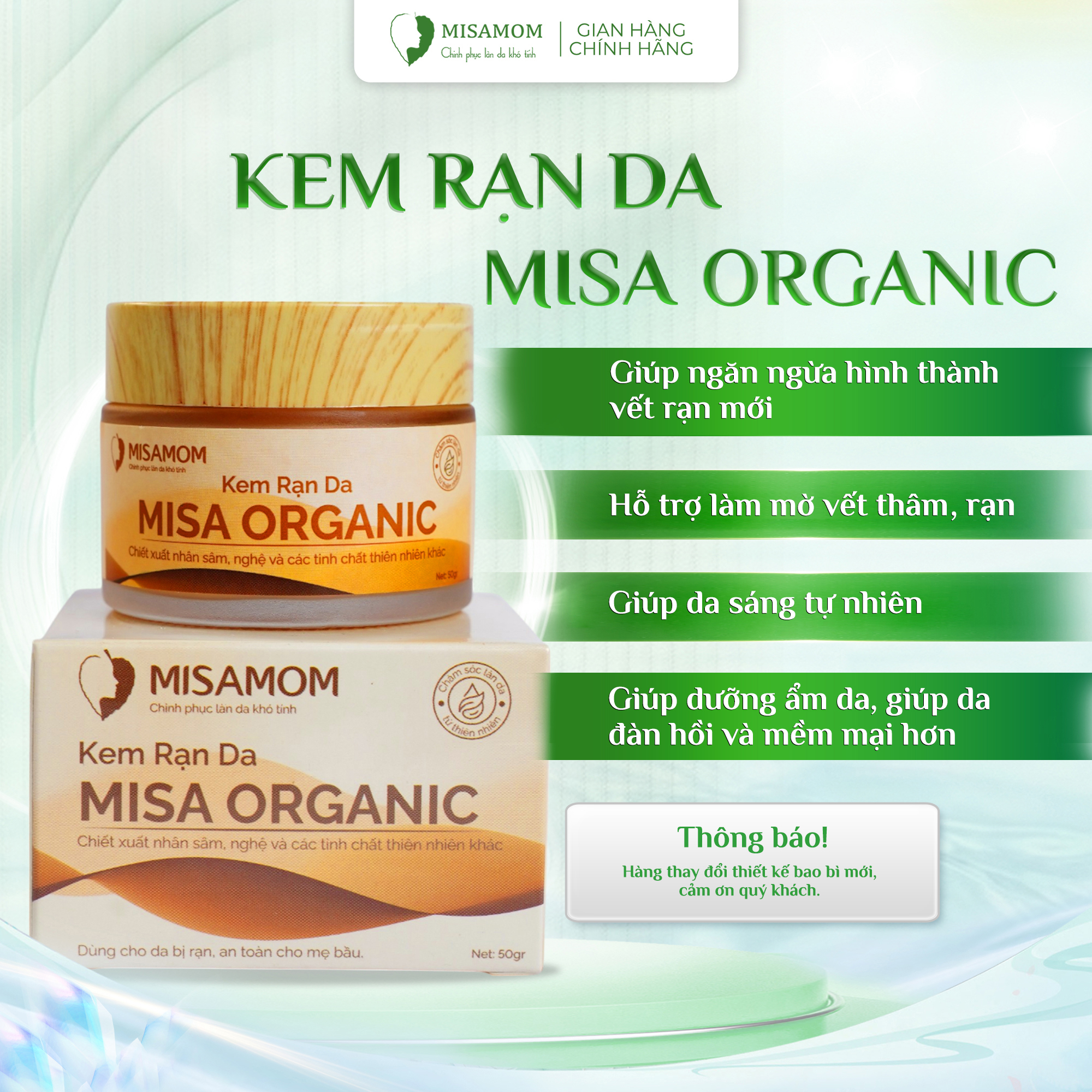 Kem Rạn Misa Organic là sản phẩm được nghiên cứu và sản xuất bởi thương hiệu mỹ phẩm dưỡng da dành cho phụ nữ mang thai Misamom. Kem dưỡng này có tác dụng ngăn chặn sự hình thành và lây lan của rạn, nám và sạm dưới da một cách an toàn cho mẹ bầu và thai nhi. Kem Rạn Misa Organic được làm chủ yếu từ các dưỡng chất của cây nhân sâm, nghệ tươi, lô hội và dầu dừa. Đây là một bài thuốc cổ truyền rất hiệu quả thường được các bà và các mẹ ngày xưa sử dụng để dưỡng da.